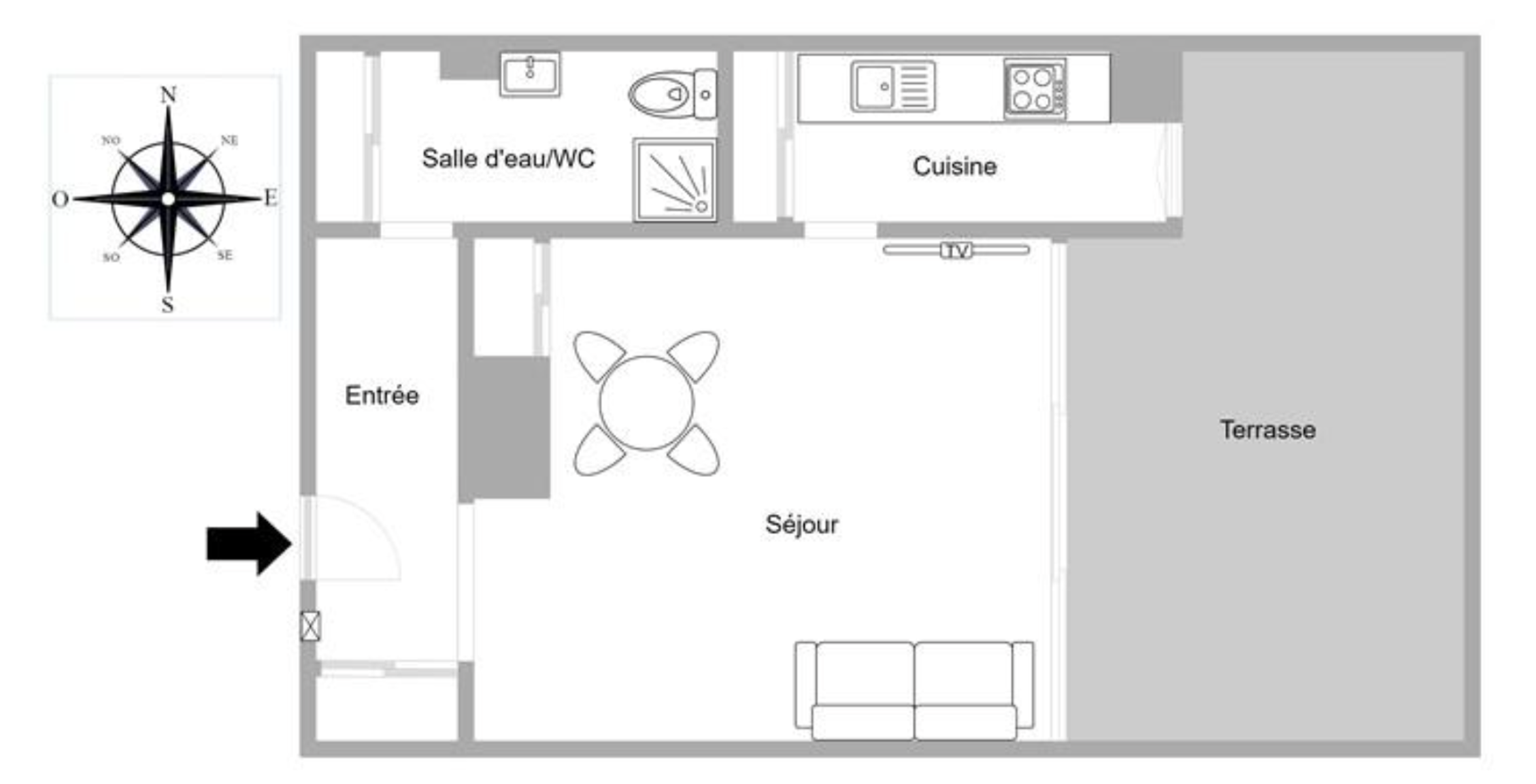 Il est composé d'une entrée avec placard ainsi qu'une salle d'eau puis le séjour avec cuisine indépendante donnant sur une terrasse de 35m2 au calme.