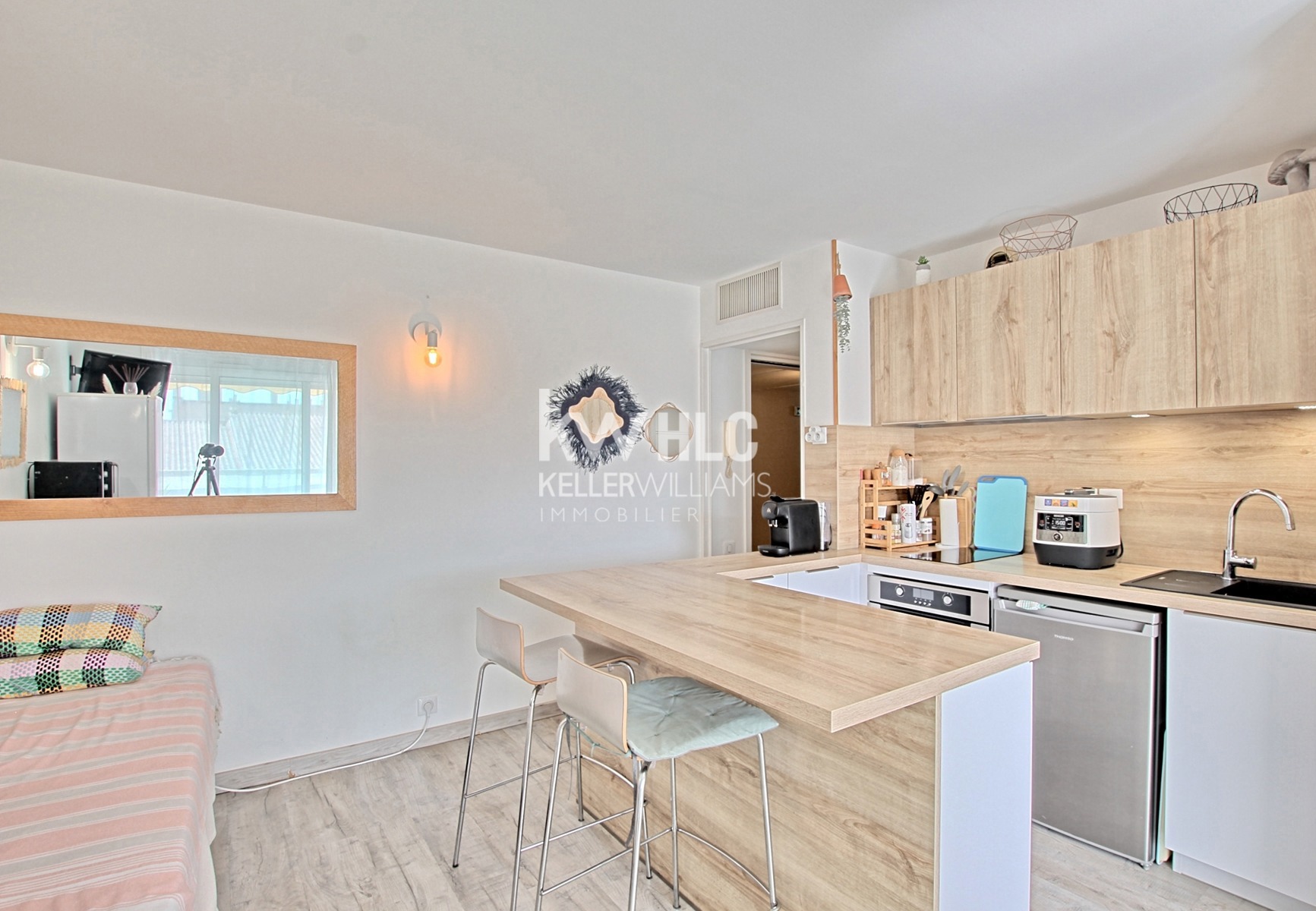 Golfe Juan - Port : Situé au 2ème étage d'une résidence avec ascenseur, cet appartement de type 2 pièces et d'une superficie de 28m² bénéficie d’une belle terrasse exposée sud, offrant un aperçu mer et une vue dégagée sur la colline, sans vis-à-vis. L'emplacement est idéal, à seulement quelques mètres du littoral et du port, et à proximité immédiate de toutes les commodités. Il se compose d'un séjour lumineux avec une cuisine ouverte aménagée et équipée, dotée d’un bar et donnant sur la terrasse. Le coin nuit, bien agencé, dispose de rangements optimisés. La salle d’eau, moderne, est équipée d’une douche à l’italienne et d’un WC intégré. Un placard de rangement supplémentaire permet de maximiser l'espace. L'appartement a été entièrement rénové et offre de nombreux équipements pour un confort optimal : double vitrage, volets roulants électriques et climatisation réversible. Le calme est absolu dans cette résidence bien entretenue, qui dispose également d'une piscine, idéale pour se rafraîchir pendant l'été. Concernant le stationnement, il est facile de se garer sur les places publiques autour de l’immeuble. Ce bien est parfait pour un premier achat, un pied-à-terre ou un investissement locatif. N'attendez plus pour découvrir cet appartement rare, contactez-nous pour plus d'informations ou pour planifier une visite.