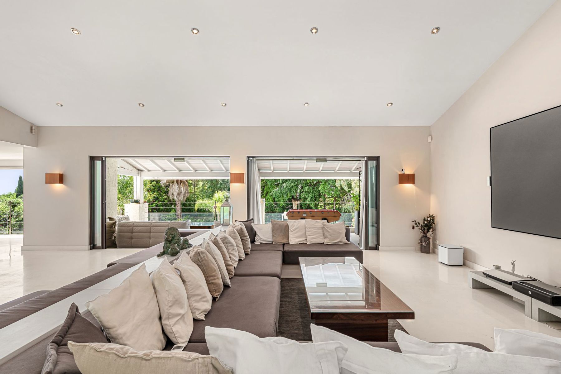 En rez-de-jardin, trois autres chambres, toutes en suite avec salle d’eau privative, complètent l’espace nuit. Ce niveau dispose également d’une cuisine d’été et d’une grande pièce polyvalente, aujourd’hui utilisée comme atelier, salle de sport ou salle cinéma. Elle peut facilement être aménagée en studio indépendant ou en appartement.
