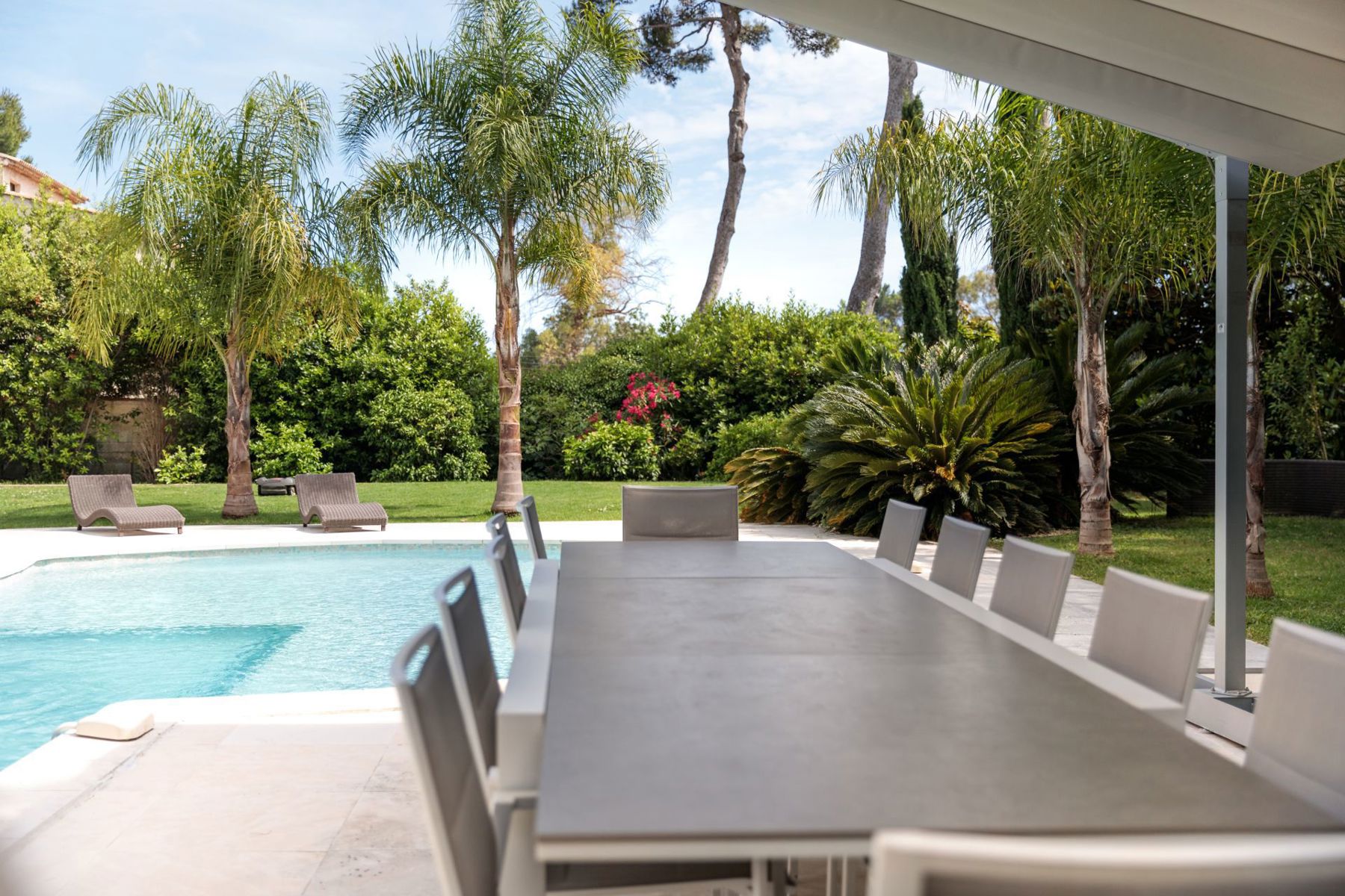 Le terrain plat de 1 543 m², sans vis-à-vis, accueille une piscine au sel de belle dimension et au design singulier. Elle constitue une véritable pièce maîtresse du jardin