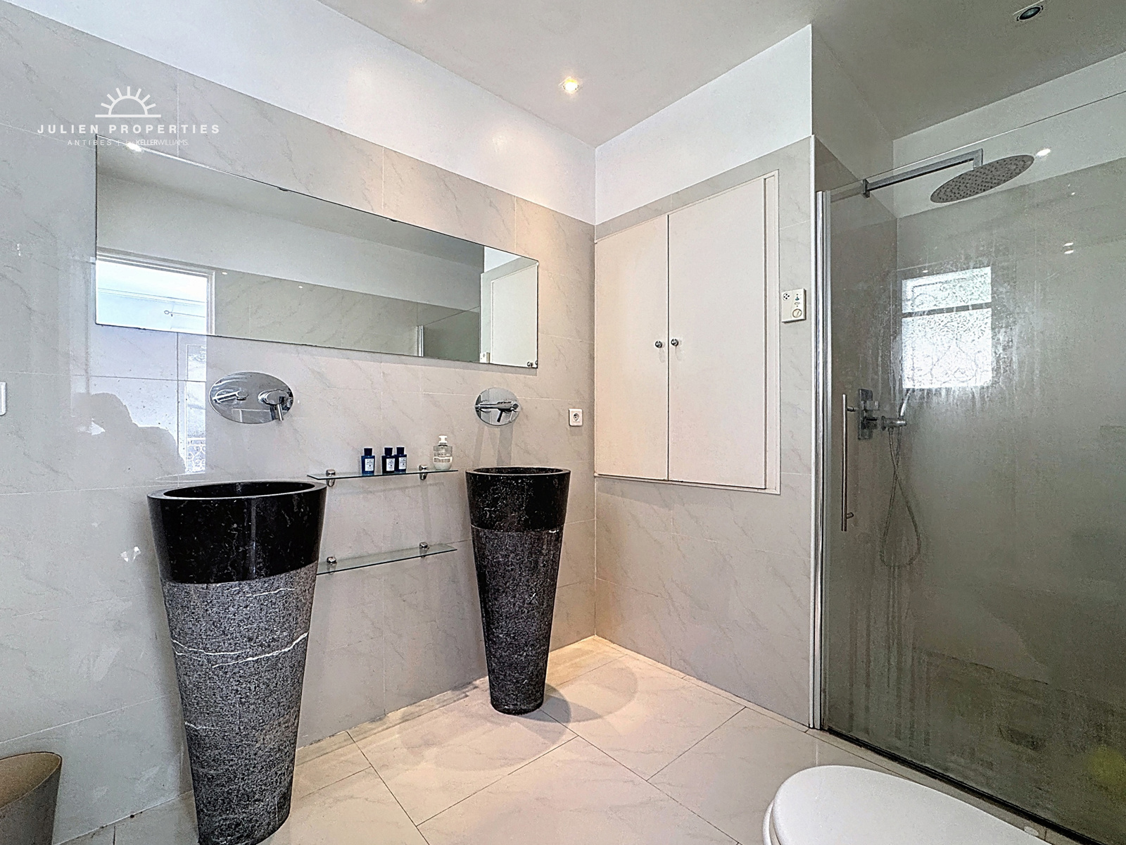 - Étage : grande chambre mansardée avec coin toilettes, lavabo et rangements