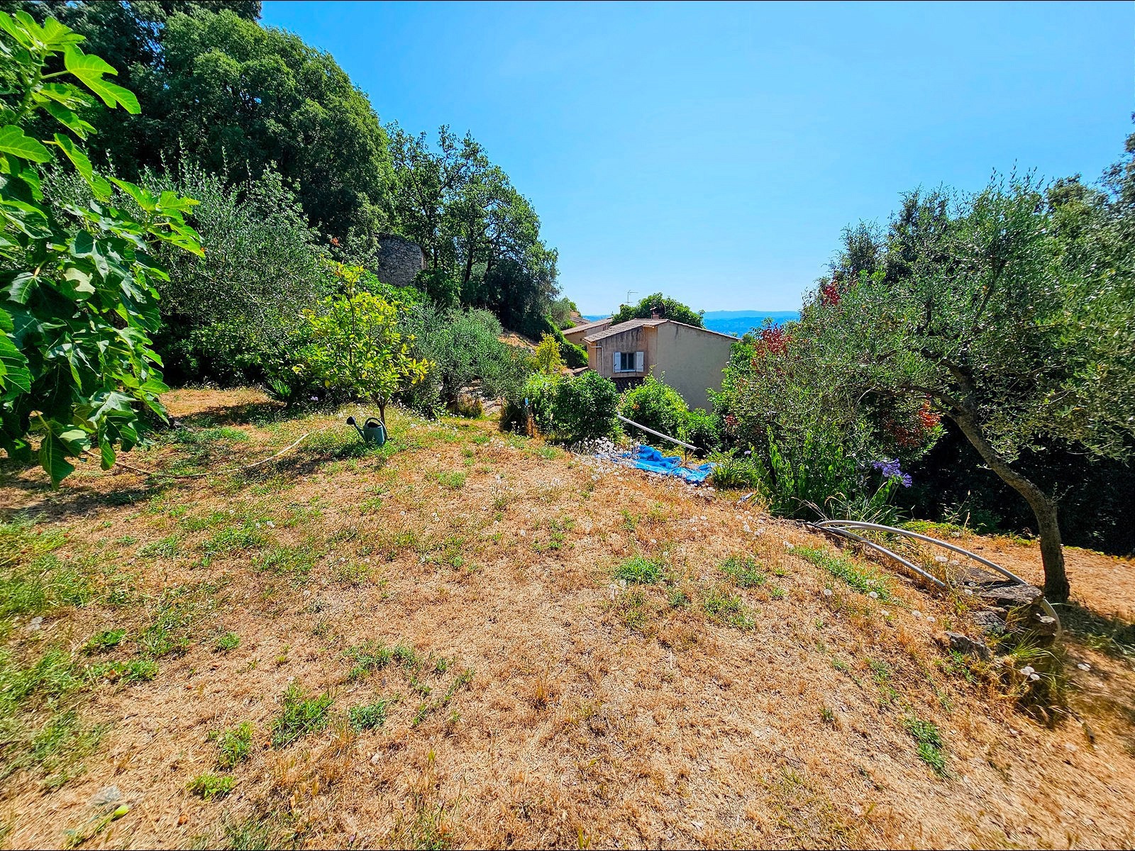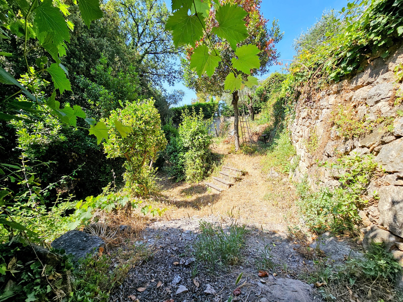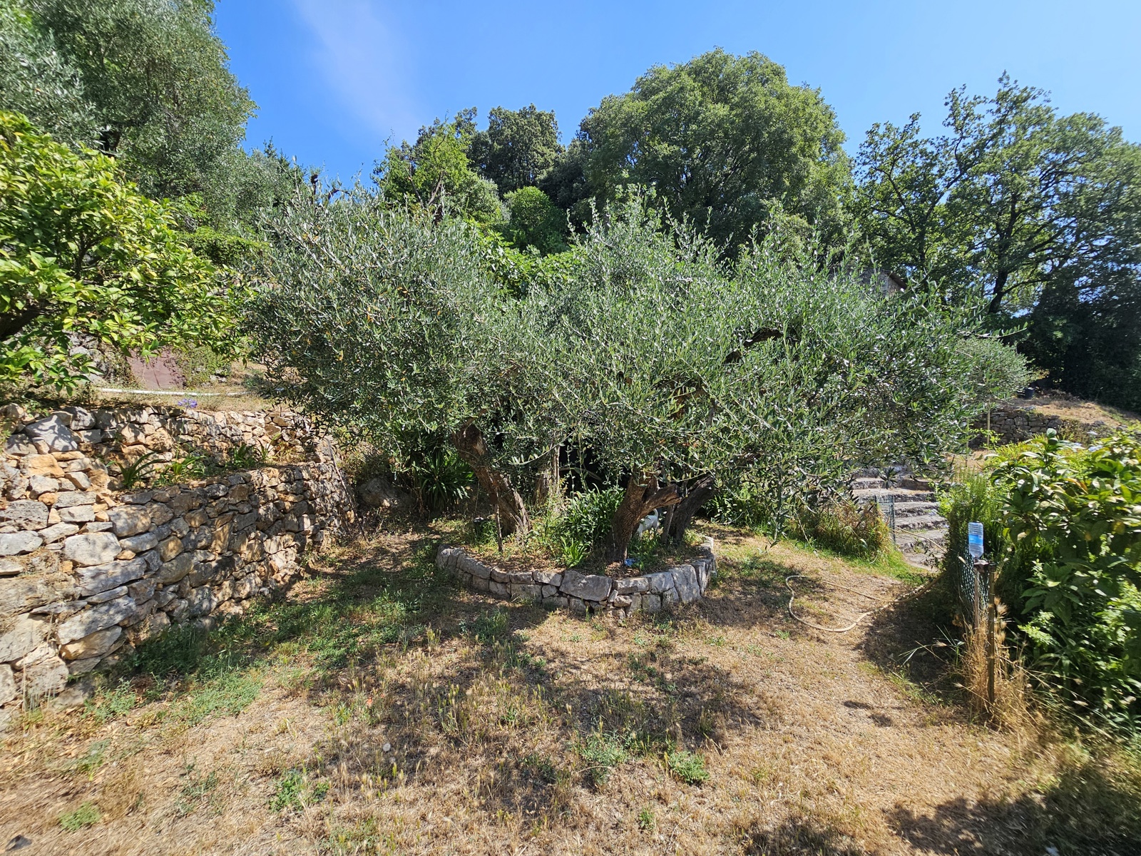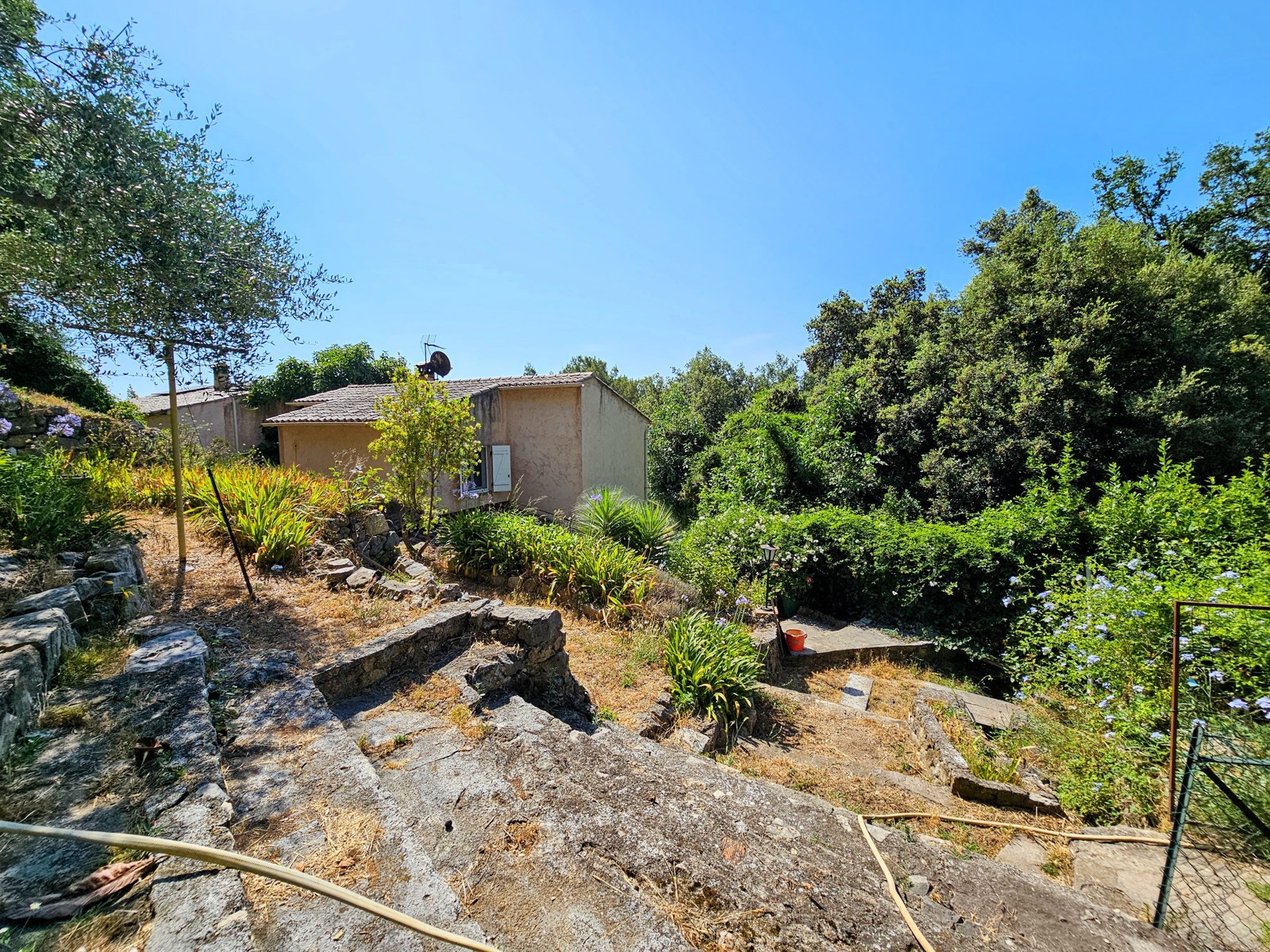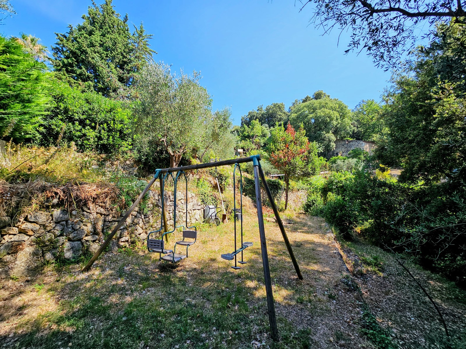 Le terrain de 1 357 m², situé à l’arrière de la maison, se déploie en plusieurs restanques larges et bien entretenues. Une configuration typique du secteur, qui crée différents espaces faciles à vivre : coin détente, jardin, jeux, ou juste un endroit où profiter du calme et de la vue.
