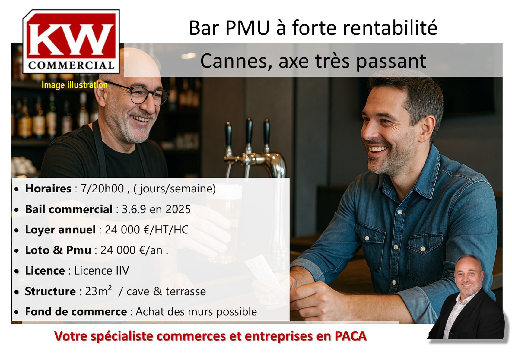 Dans un quartier animé de Cannes, ce Bar PMU de 23m² est une affaire à fort potentiel. Avec une clientèle fidèle, un chiffre d'affaires stable, et un résultat d'exploitation positif, ce commerce offre une excellente rentabilité. Les coûts de personnel maîtrisés et une fiscalité modérée permettent de maximiser les marges, rendant l'activité encore plus attractive. Ses horaires avantageux (8h-20h) permettent de concilier facilement vie professionnelle et familiale. Rendement jeux régulier, fort potentiel de développement, et possibilité d'acquérir les murs pour sécuriser votre investissement. Emplacement de premier choix dans une zone commerçante fréquentée. Ne laissez pas passer cette opportunité ! Contactez-nous dès maintenant pour en savoir plus et organiser une visite.