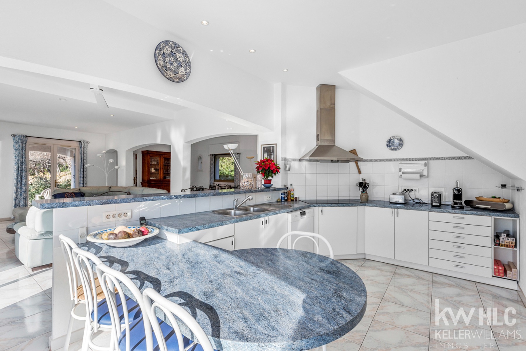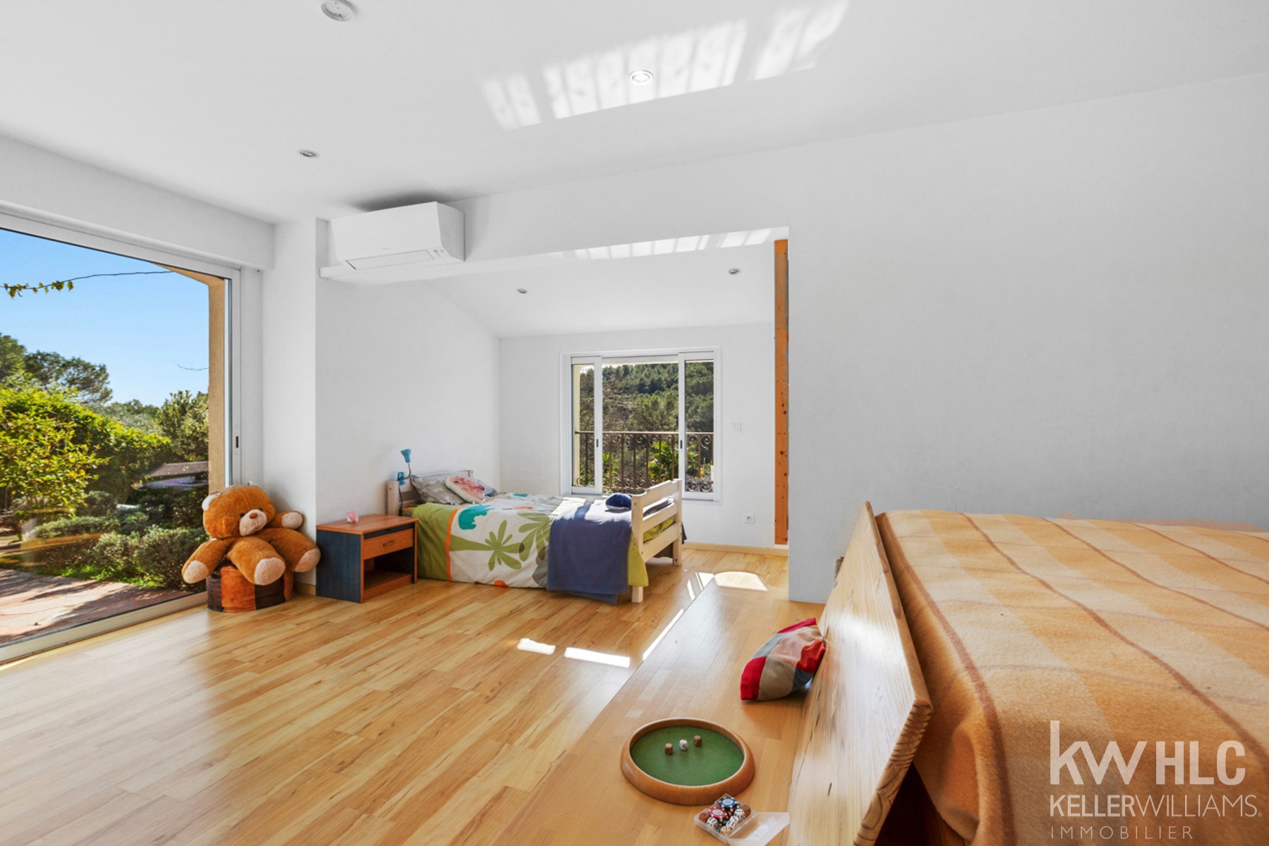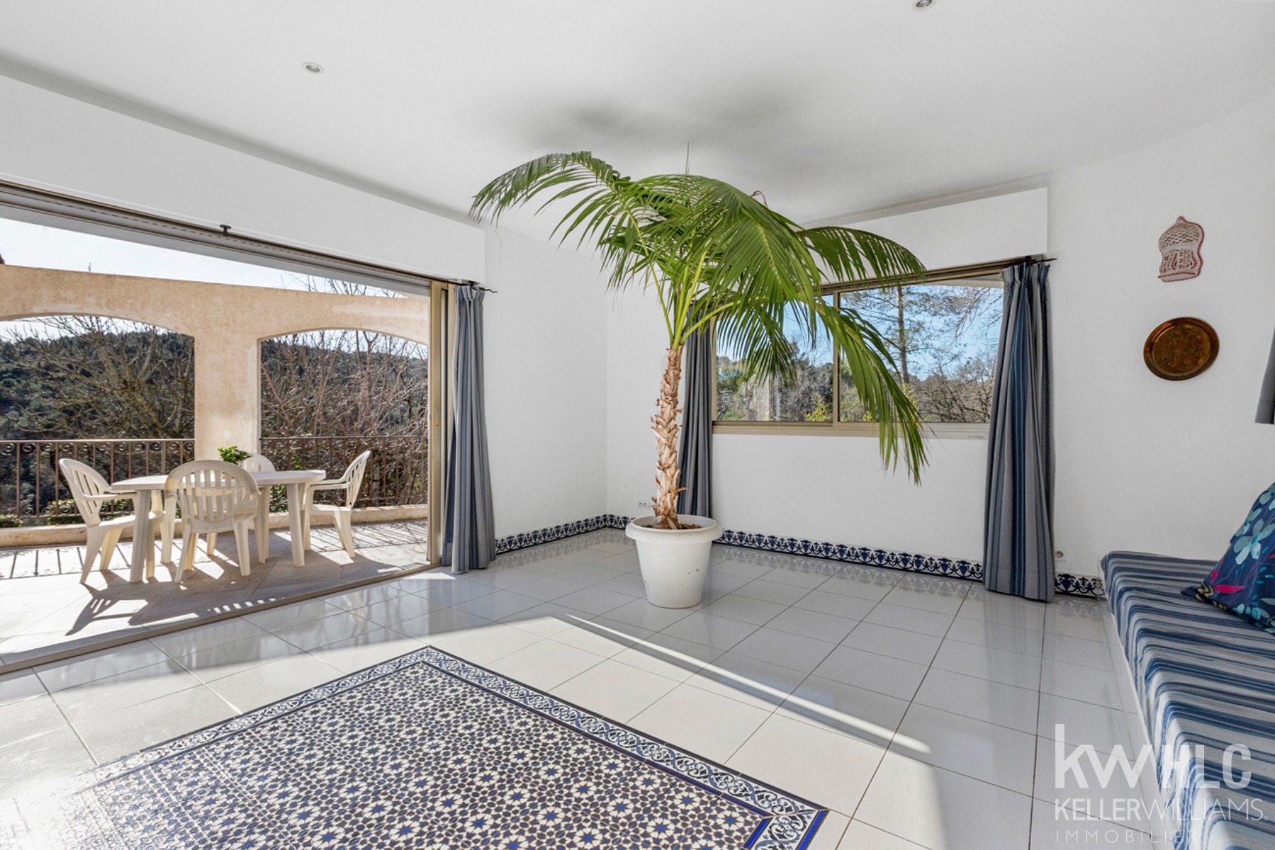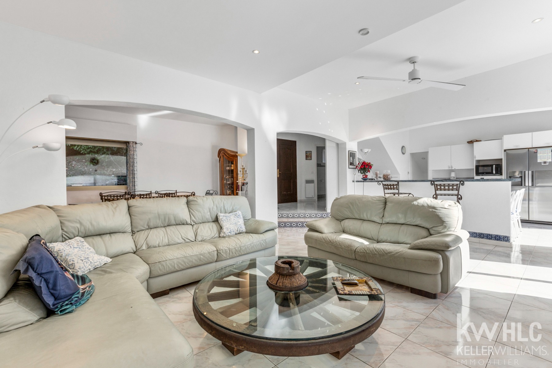 VALBONNE – Villa d’architecte au cœur d’un domaine prisé Située dans un domaine sécurisé et résidentiel très recherché, à quelques minutes à pied du charmant village de Valbonne et proche des écoles internationales, cette villa d’architecte en demi-niveaux séduit par son style contemporain et sa distribution fluide des espaces. Dès l’entrée, vous découvrirez un vaste espace de vie de près de 100 m² baigné de lumière, composé d’un double salon, d’une salle à manger, d’une cuisine ouverte avec arrière-cuisine. De larges baies vitrées à galandage offrent une belle continuité entre l’intérieur et l’extérieur, avec une vue dégagée sur le jardin arboré et la forêt. La villa comprend 4 chambres réparties intelligemment sur différents demi-niveaux pour préserver l’intimité de chacun. La suite parentale de 45 m² bénéficie d’une terrasse privative, et chaque chambre dispose de sa propre salle de bain ou salle d’eau. Un studio indépendant entièrement équipé, accessible par une entrée séparée en rez-de-jardin, constitue un véritable atout. Il est idéal pour accueillir des invités, exercer une activité professionnelle ou envisager une location autonome. À l’extérieur, une piscine avec son espace douche et sanitaire complète cet ensemble harmonieux, au calme absolu. Les + : Environnement calme et verdoyant Vue dégagée sans vis-à-vis Bus scolaire à pied Piste cyclable à proximité Domaine sécurisé N'hésitez pas à contacter votre conseiller immobilier KW HLC pour plus de renseignement ou programmer une visite de cette villa.