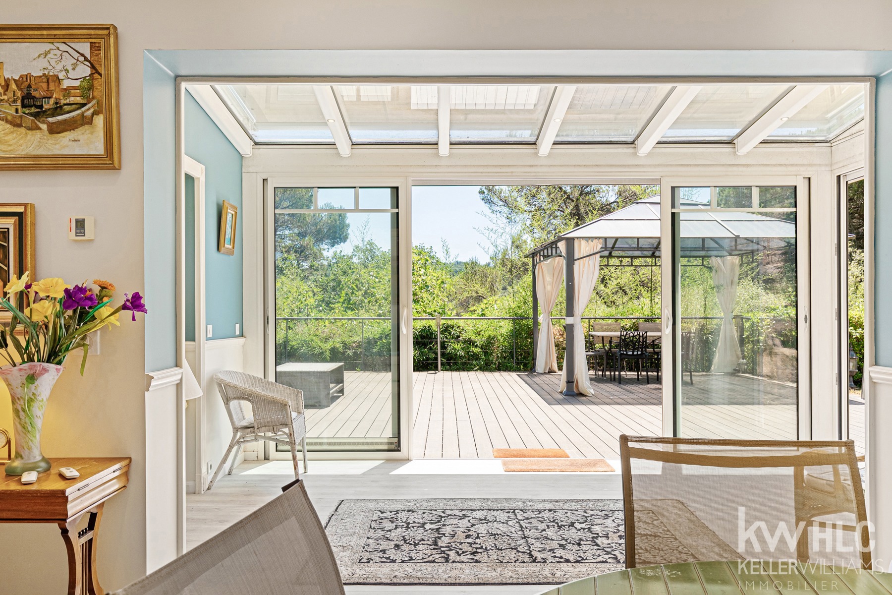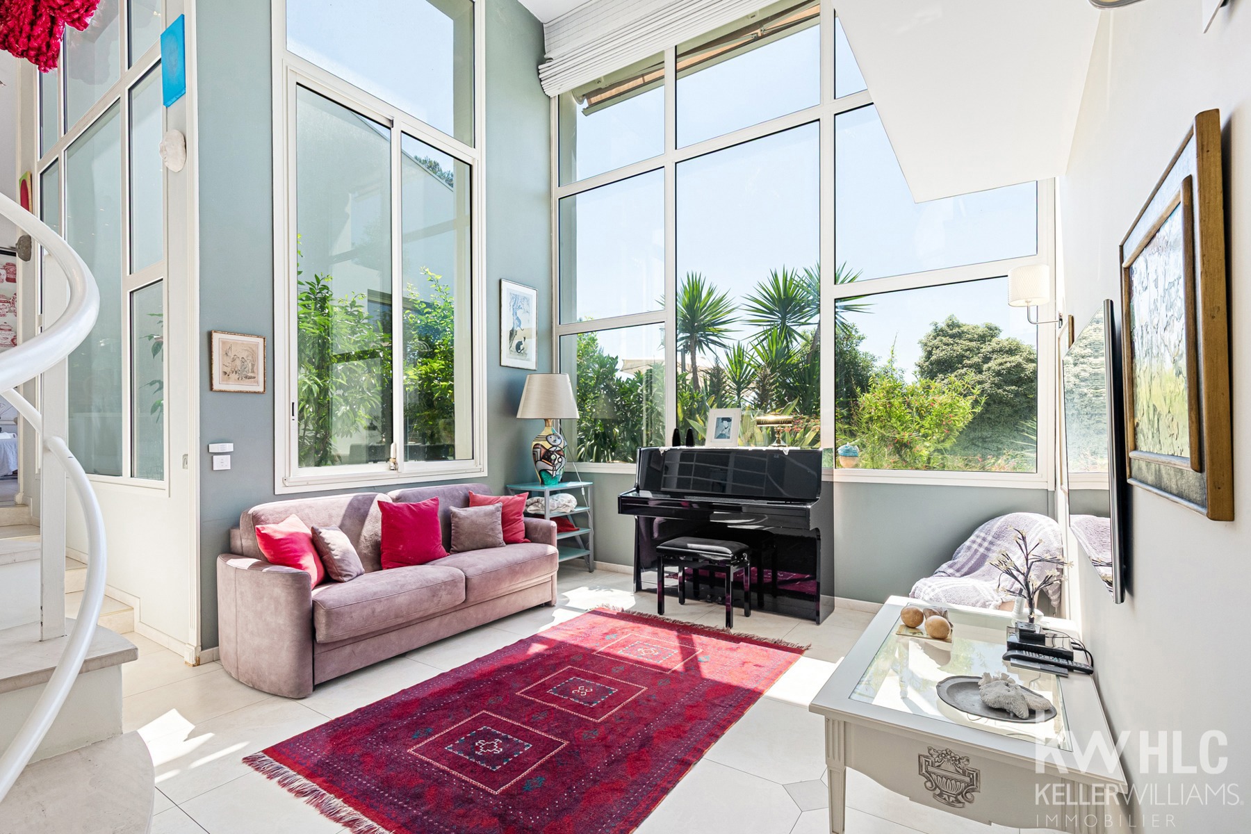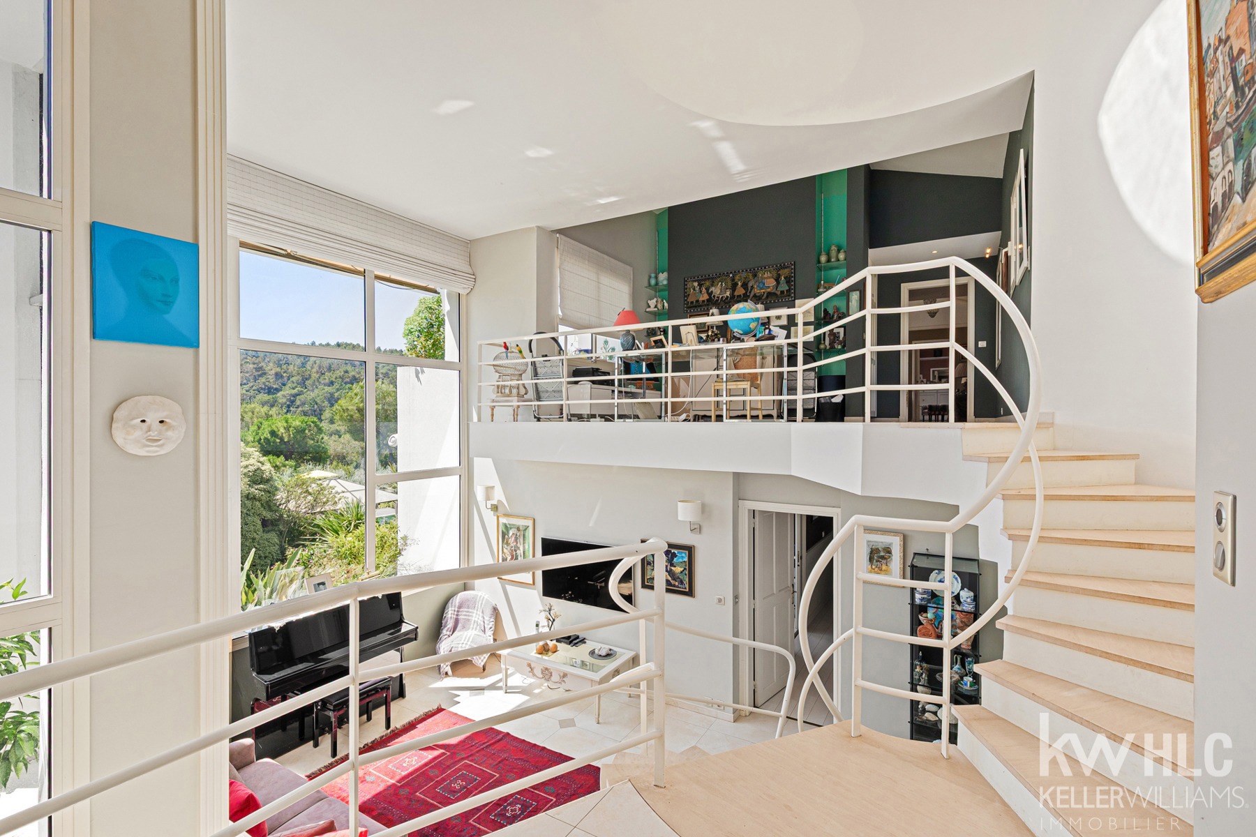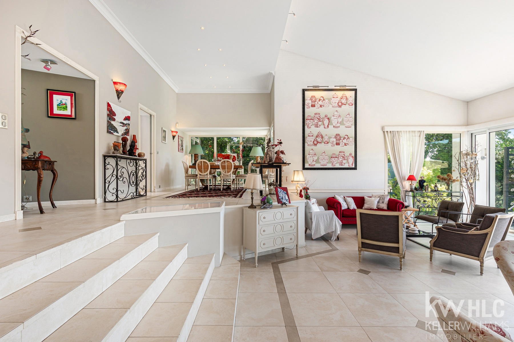 Elle se compose d'un hall d'entrée lumineux qui mène à un vaste salon avec plafond en double hauteur, baigné de lumière par de grandes ouvertures donnant sur la terrasse et le jardin plein sud.