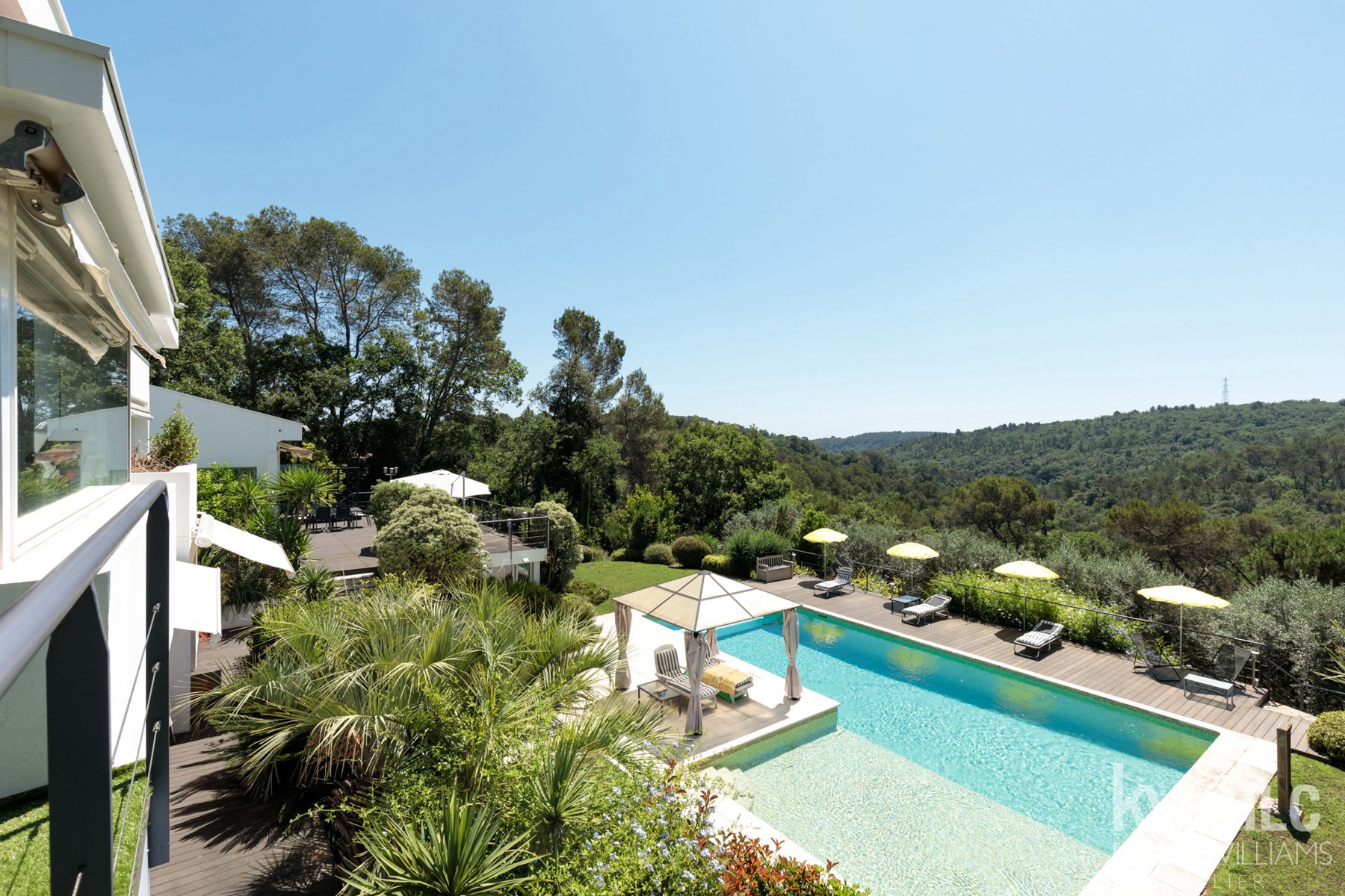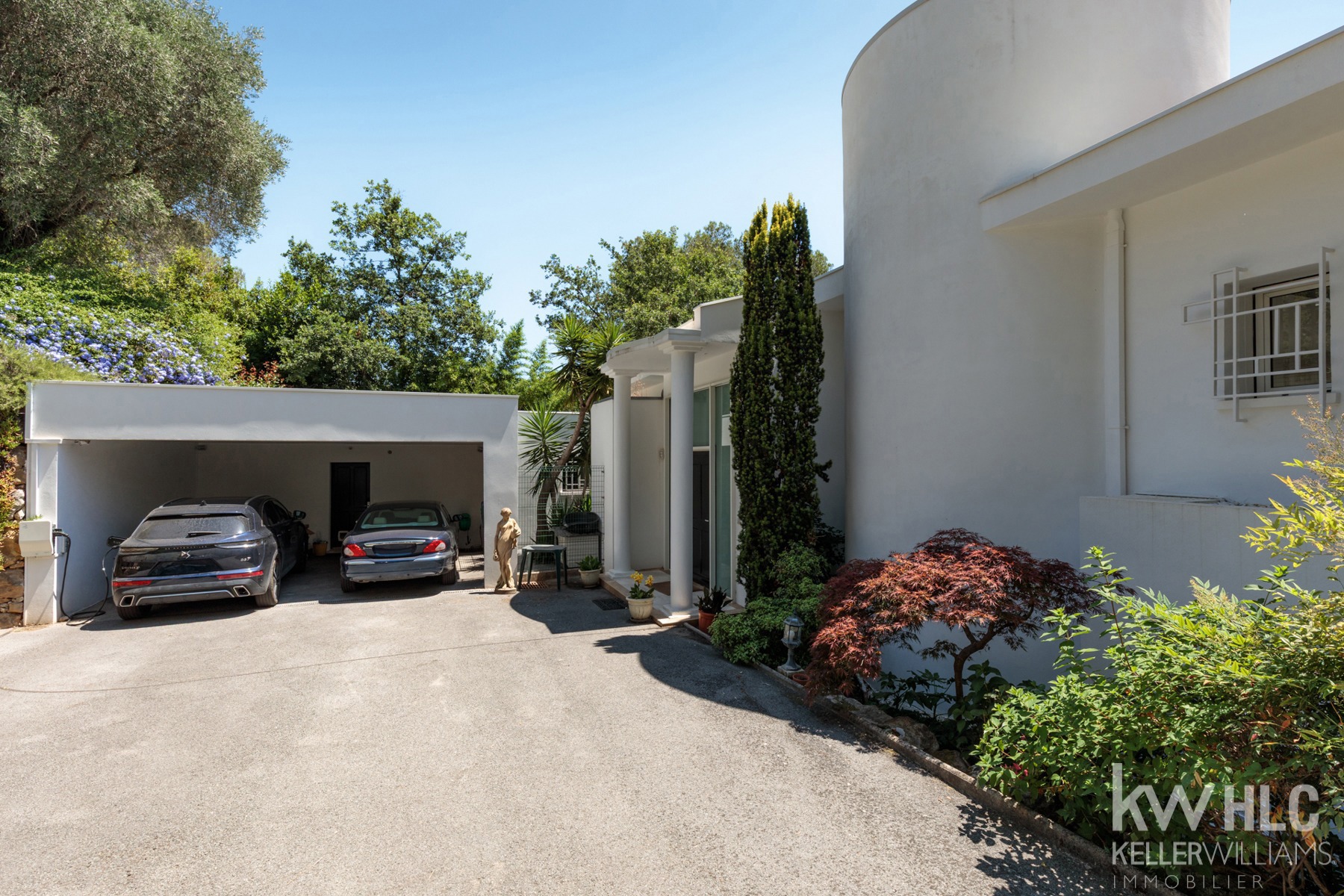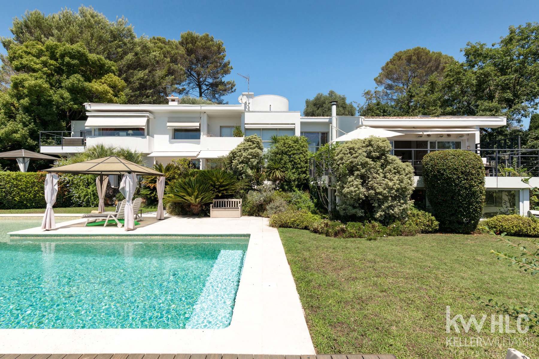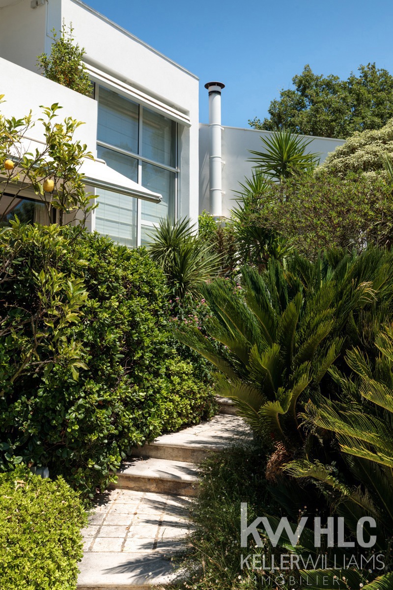 Nichée dans un écrin de verdure, magnifique villa d’architecte aux lignes contemporaines dans un domaine sécurisé à quelques minutes à pieds du fameux village de Valbonne.