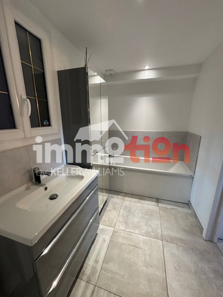au rez de chaussée: Hall d’entrée _,Pièce de vie ouvert sur cuisine aménagée et équipée (43 m²) _ 1 salle de bains offrant douche et baignoire_ 1 WC indépendant _ 1 coin Lingerie -sellier